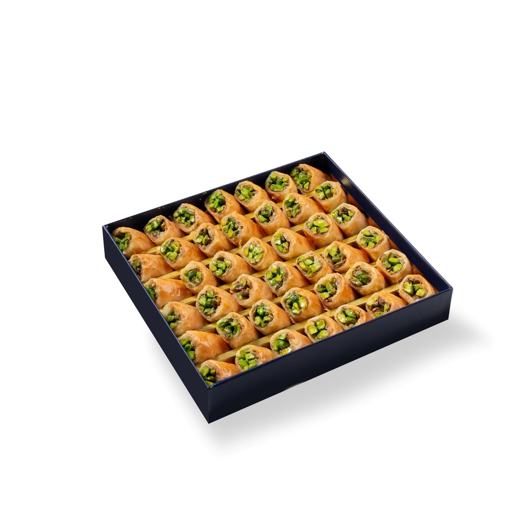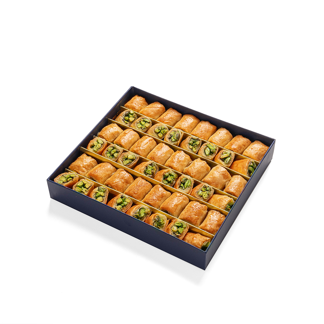 لفائف البقلاوة هذه محشوة بالفستق الحلبي الكامل، وتُضفي نكهةً مقرمشةً وغنيةً. الفستق غنيٌّ بالعناصر الغذائية ومضادات الأكسدة، المفيدة للجهاز القلبي الوعائي والصحة العامة. تُعدّ هذه اللفائف لذيذةً وقيّمةً للمناسبات الخاصة أو لمجرد الاستمتاع.