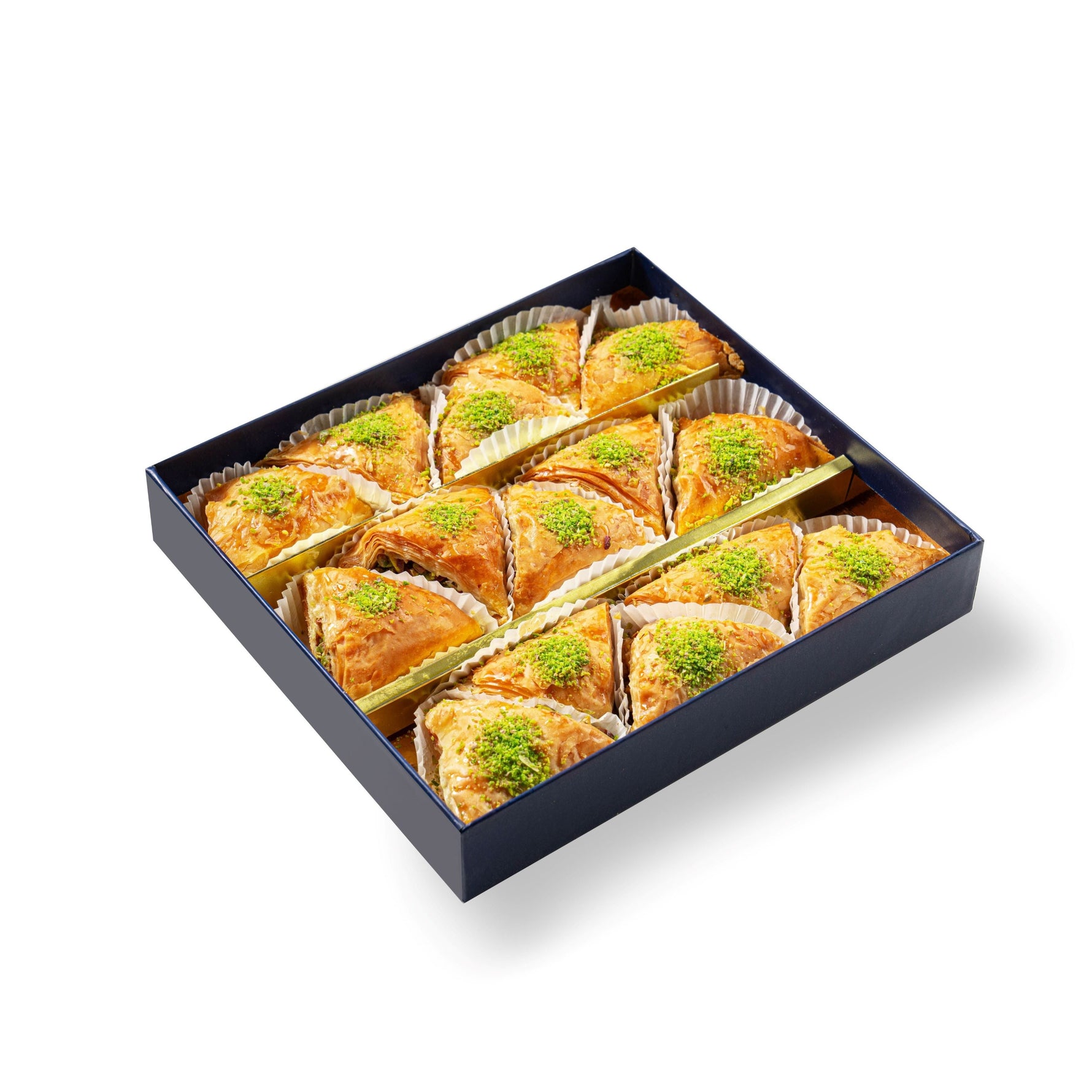 وربات بالفستق معجنات شرقية كلاسيكية مصنوعة من عجينة الفيلو المقرمشة، محشوة بالفستق الطازج المفروم ناعماً. تُضفي هذه المثلثات الذهبية المائلة للبني تبايناً رائعاً بين العجينة الطرية والحشوة الجوزية الغنية، مثالية للاحتفالات أو كحلوى فاخرة.