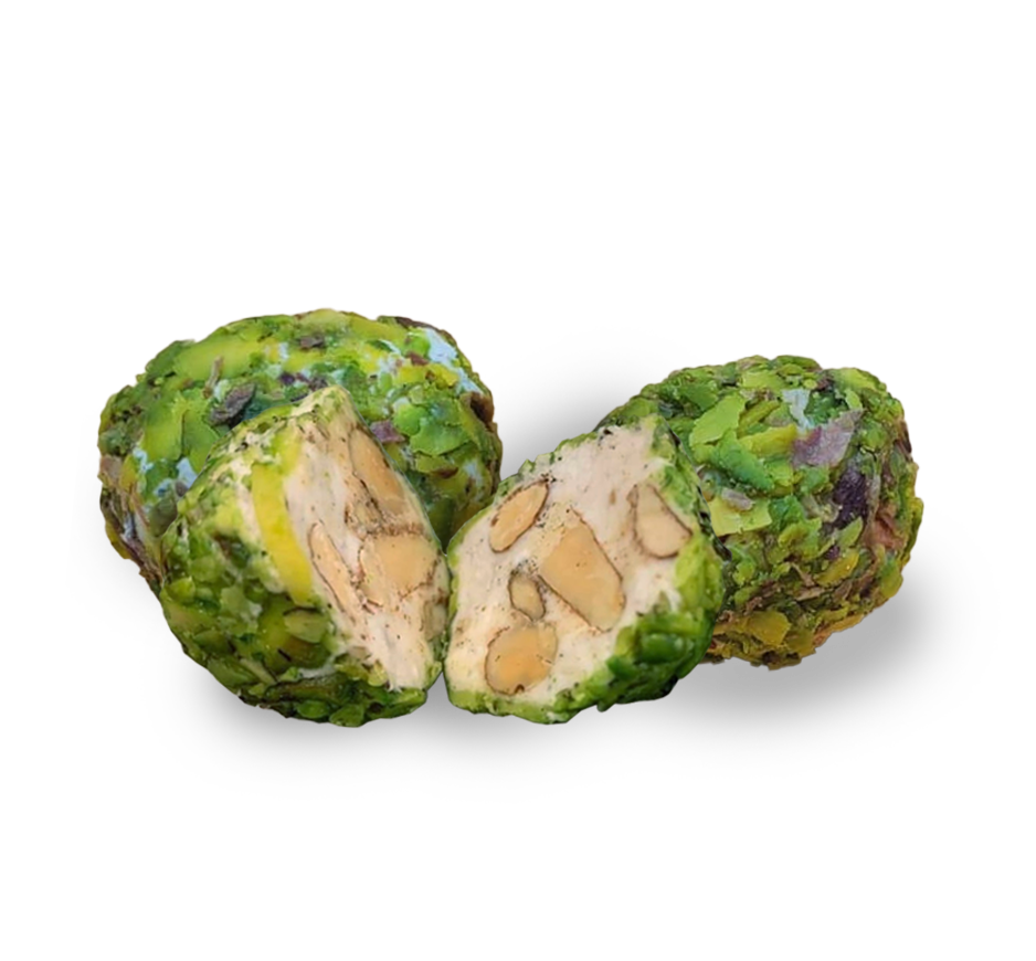 Ingredients: almond kernels, sugar, egg white, pistachio kernels, cardamom.