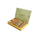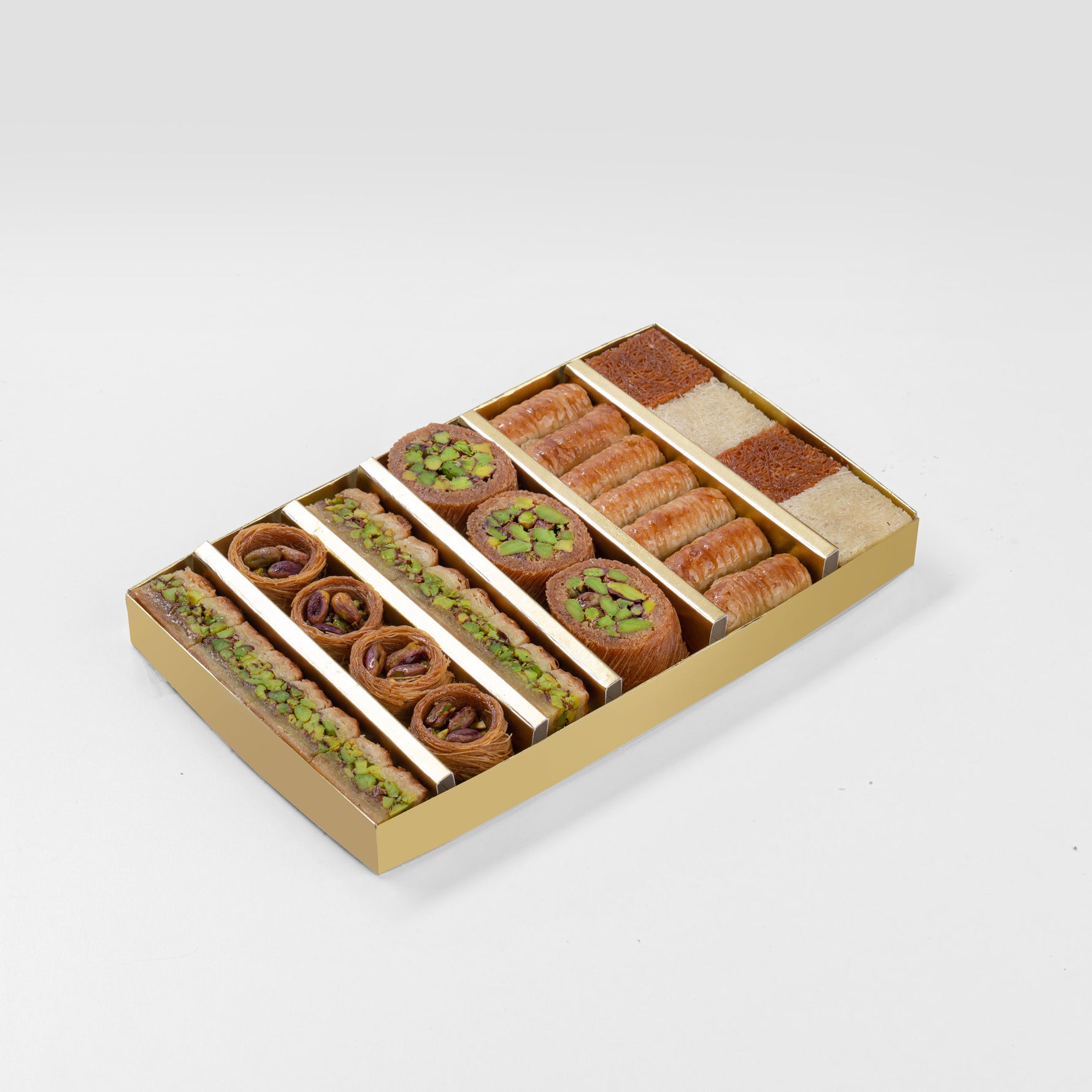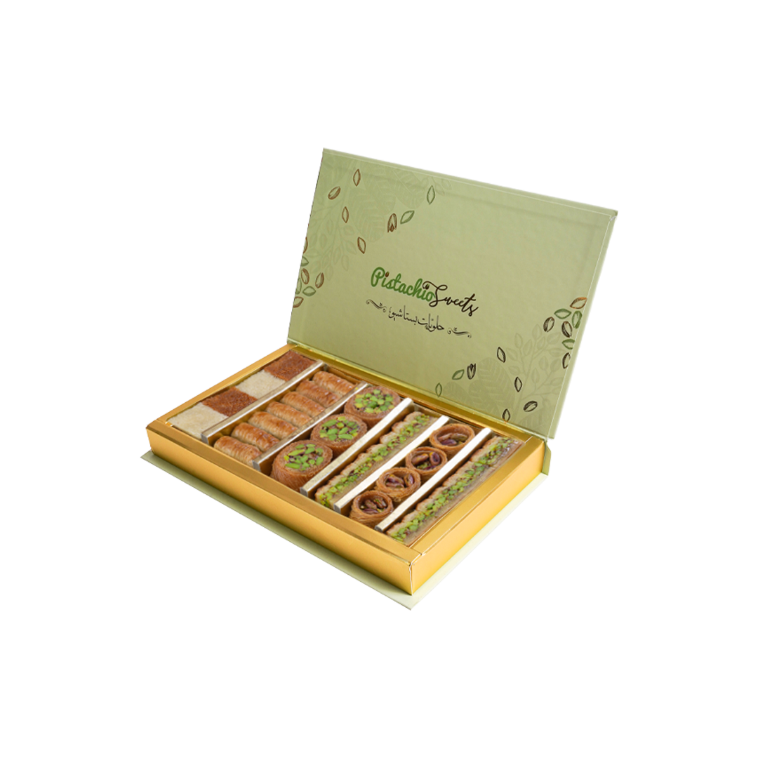 A box of Pistachio Sweet Baklava-mix contains five types of sweets and oriental baklava.